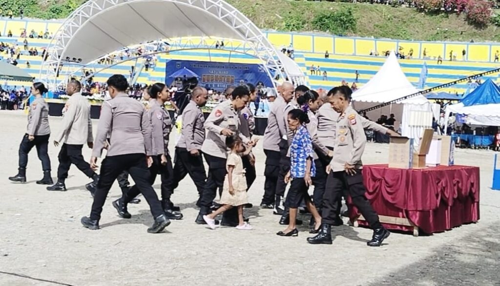 Dengan seragam kebanggaan, para anggota polisi berdiri sejajar bersama jemaat dari berbagai daerah di Tanah Papua. Mereka hadir bukan sekadar sebagai penegak hukum, tetapi juga sebagai pelayan Tuhan yang membawa pesan kasih dan kedamaian.