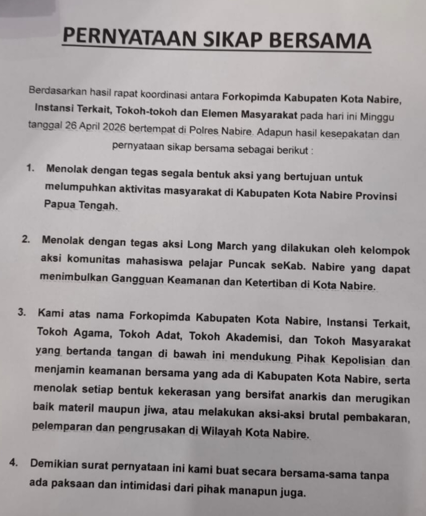 Kapolres Nabire Pimpin Rakor Pengamanan Rencana Aksi Unjuk Rasa Mahasiswa Nabire, Papua Tengah – Kepala Kepolisian Resor (Kapolres) Nabire, AKBP Samuel D. Tatiratu, S.I.K., memimpin Rapat Koordinasi (Rakor) terkait rencana aksi unjuk rasa yang akan digelar oleh mahasiswa Puncak se-Indonesiadi Kabupaten Nabire. Kegiatan tersebut berlangsung di Aula Wicaksana Lagawa Mapolres Nabire pada Minggu (26/4/2026).