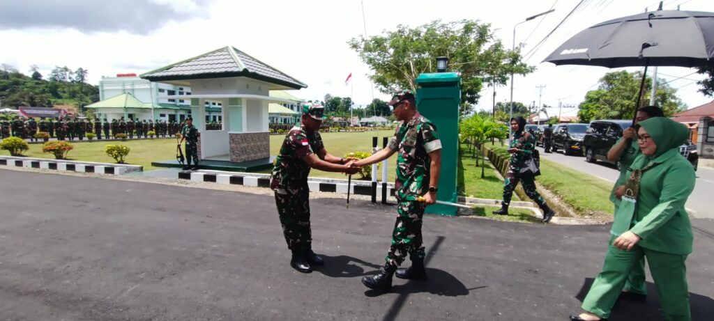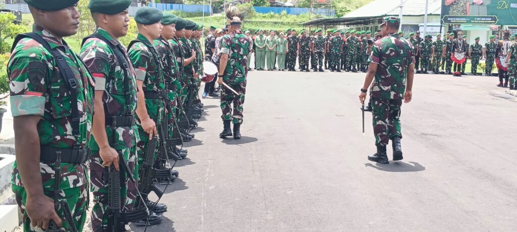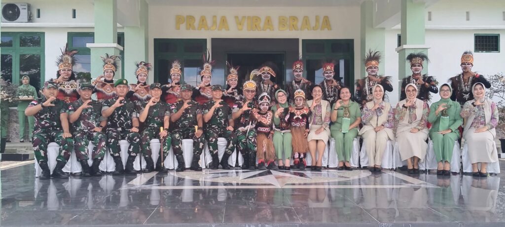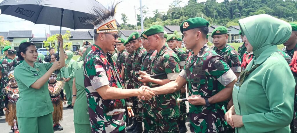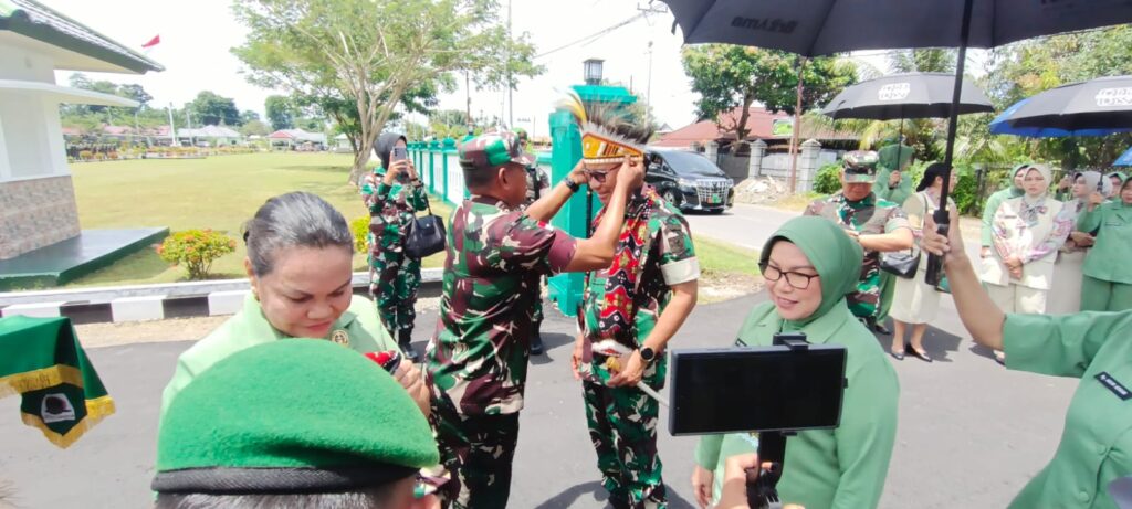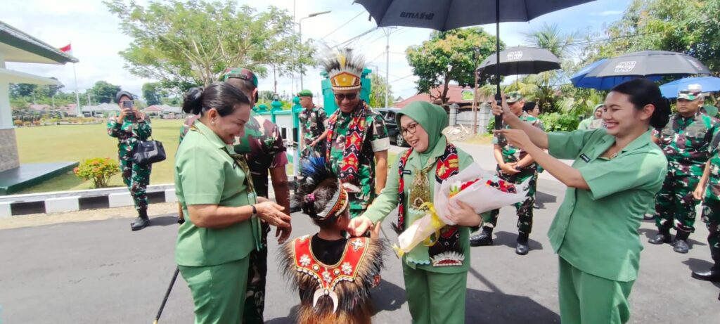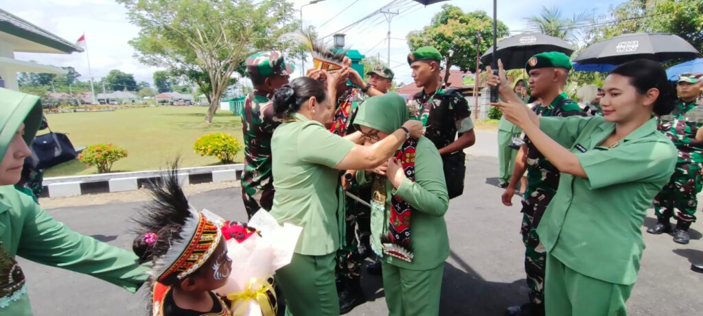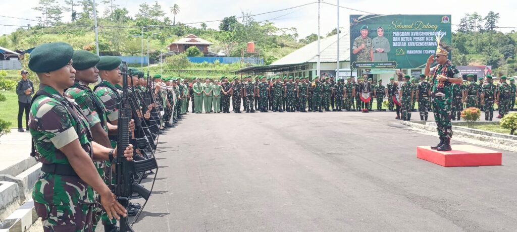 Nabire, Papua Tengah – enagonews – Panglima Komando Daerah Militer (Pangdam) XVII/Cenderawasih Mayjen TNI Amrin Ibrahim, S.I.P mengunjungi Markas Komando Distrik Militer (Makorem) 173/ Praja Vira Braja (PVB), Selasa (21/10/2025). Kedatangan Pangdam yang didampingi Ibu Amrin Ibrahim itu disambut langsung Danrem 173/PVB Brigjen TNI Fritz W.R.Pelamonia didampingi Ibu Fritz Pelamonia mendapat kalungan selempang dan Mahkota Khas Papua.