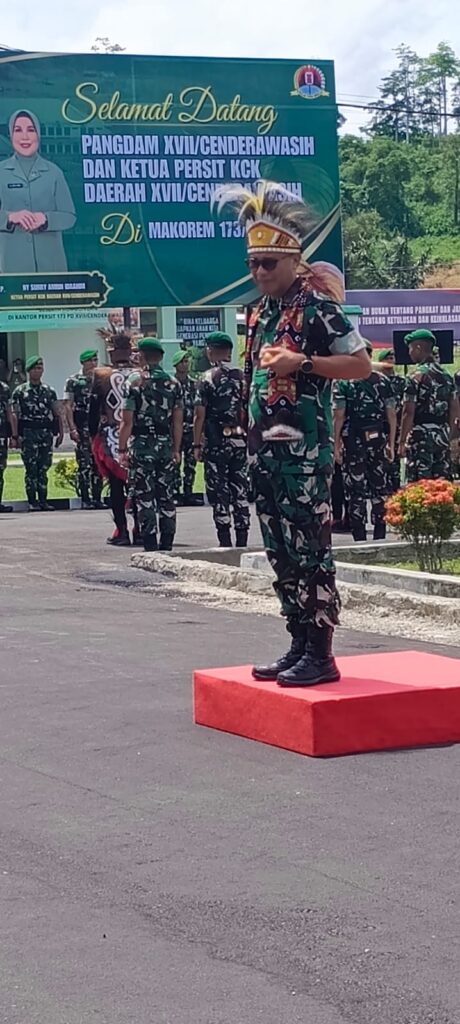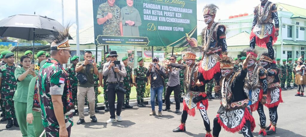 Kehangatan Jenderal Bintang Dua itu juga dissmbut tarian adat Papua dan barisan prajurit TNI Korem 173/PVB yang berjejer rapi dikanan kiri menuju Gedung Utama Korem 173/PVB.