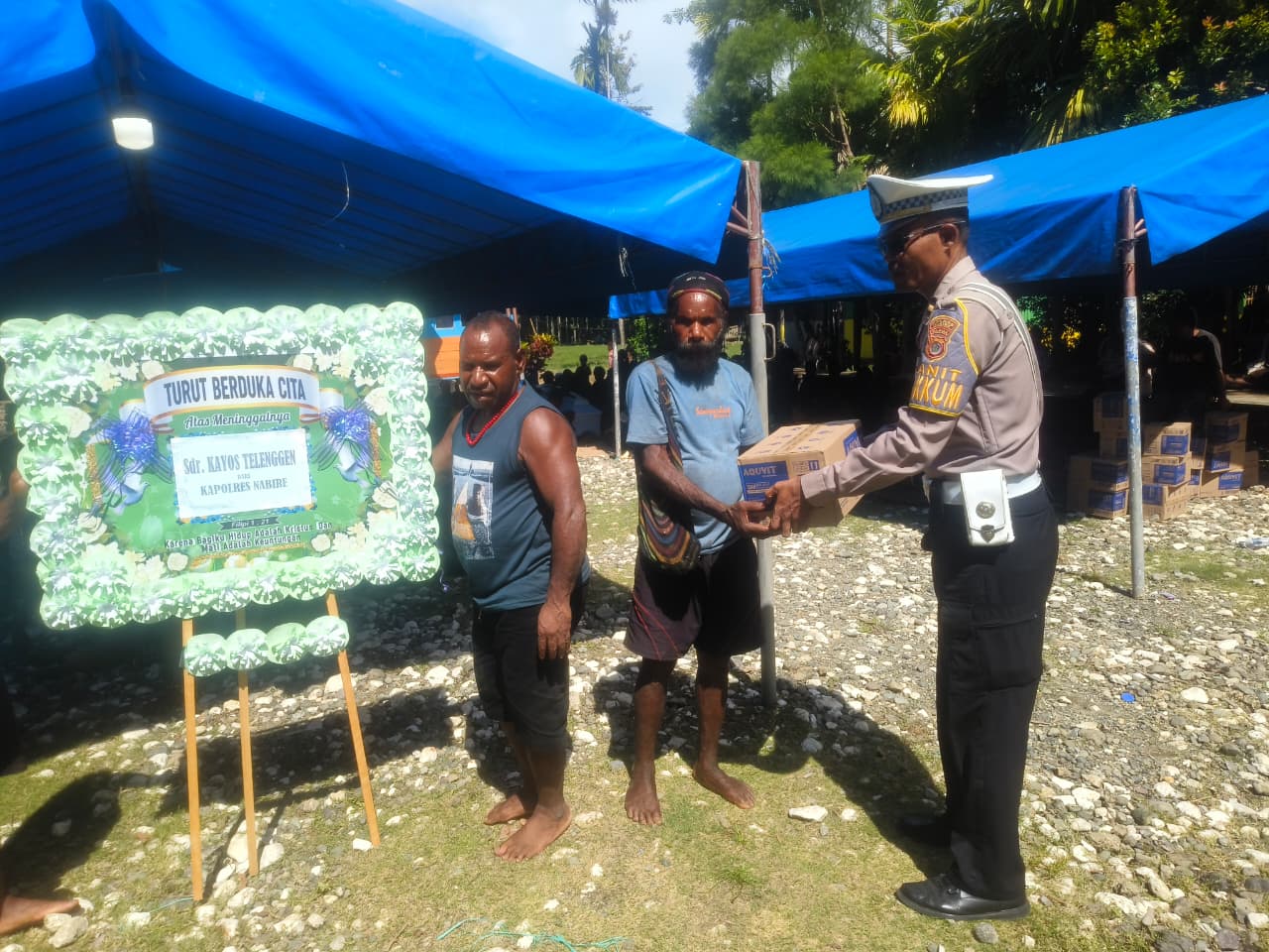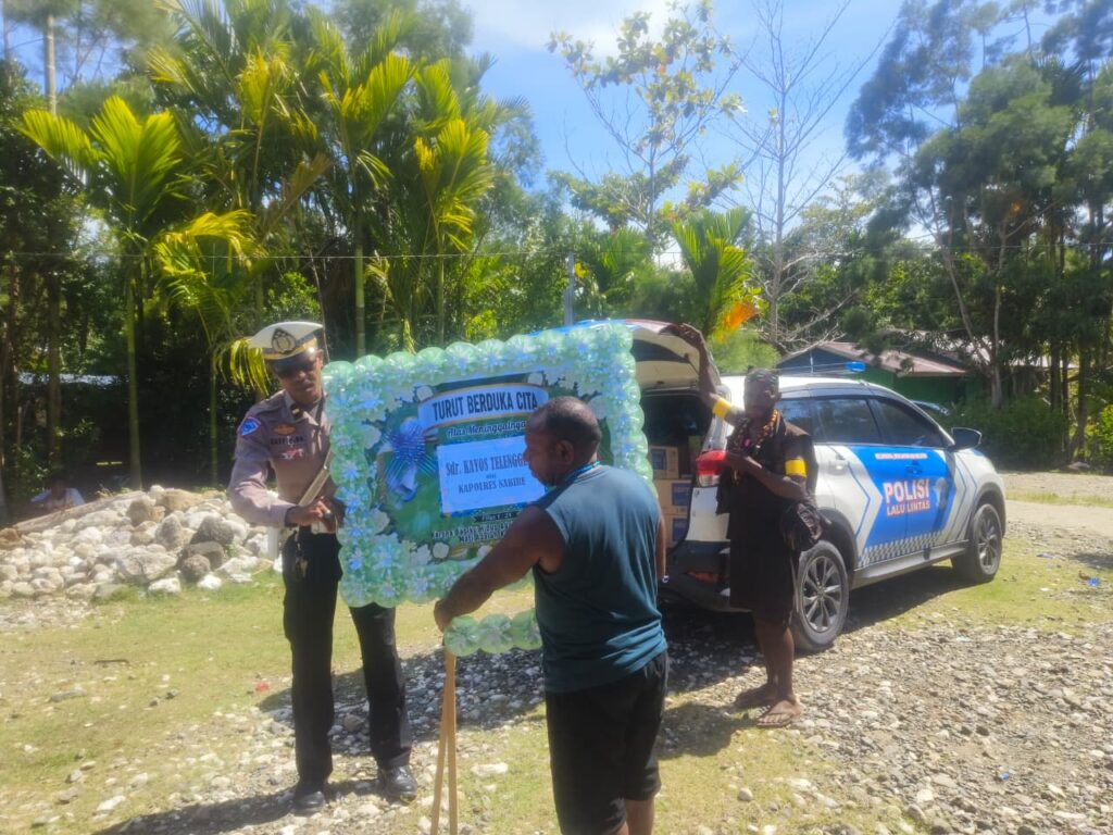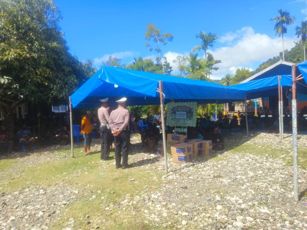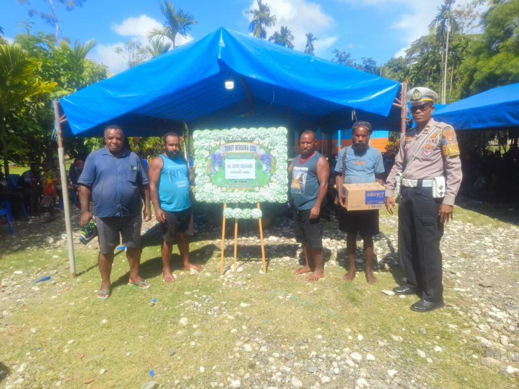 Nabire – enagoNews – Kepedulian terhadap korban kecelakaan lalu lintas kembali ditunjukkan jajaran Sat Lantas Polres Nabire. Melalui Unit Gakkum, aparat kepolisian mendatangi rumah duka almarhum Kayos Telenggen di Kampung Rawaudo, Distrik Teluk Kimi, Kabupaten Nabire, Selasa (28/4/2026).